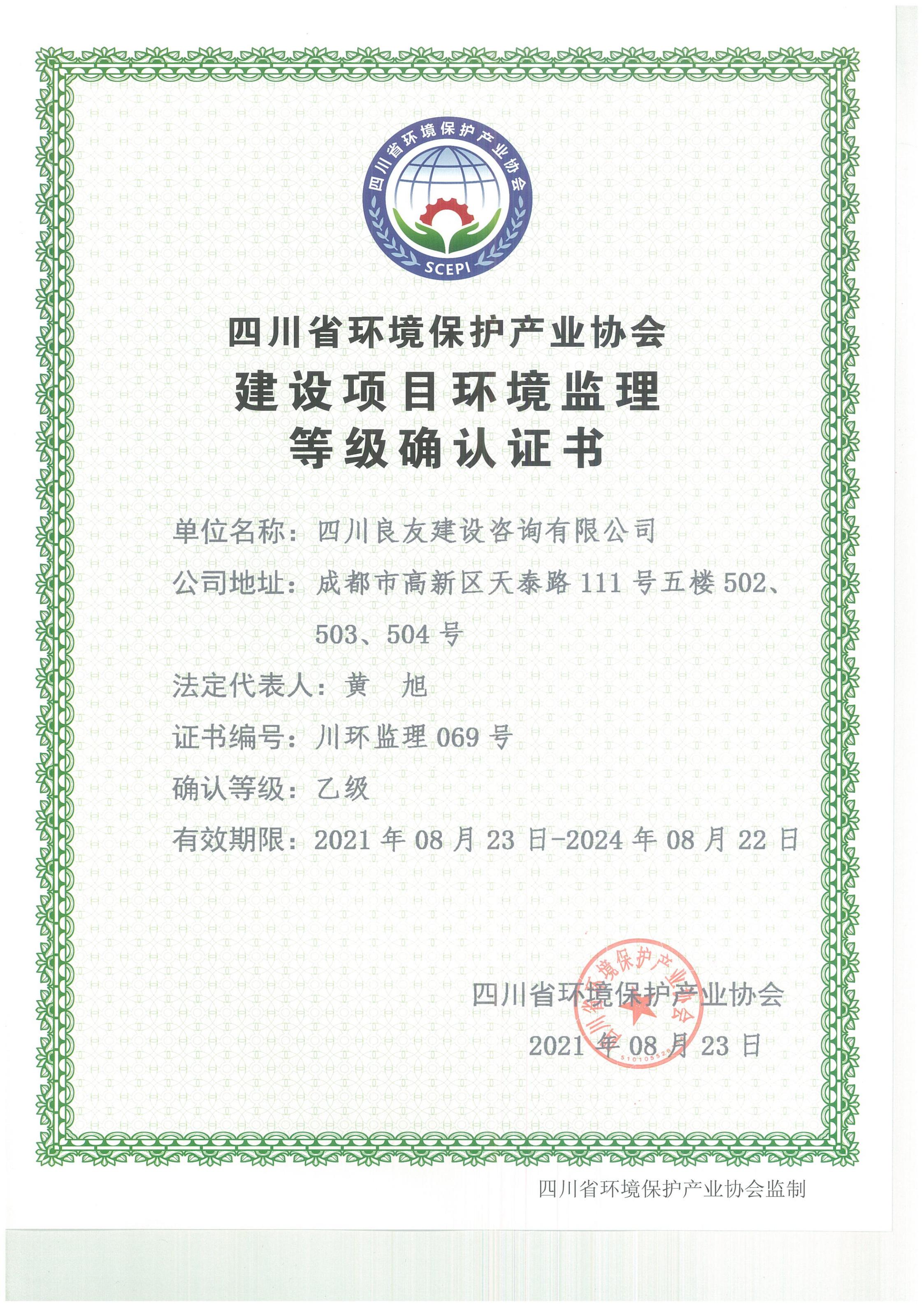 四川省環(huán)境保護(hù)產(chǎn)業(yè)協(xié)會(huì)建設(shè)項(xiàng)目環(huán)境監(jiān)理等級(jí)確認(rèn)證書(shū)(乙級(jí))